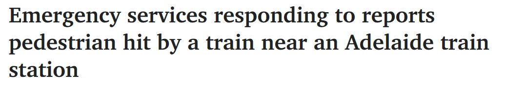 据报道,一名行人在Emerson 火车站附近的Black Forest被火车撞到。 在救护车救治伤者的同时,乘客仍留在列车上。 阿德莱德和Oaklands之间的Seaford line铁路服务已经停止。 图文来源:The Adverti ...