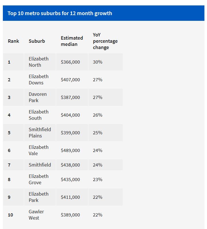 PropTrack的最新数据显示,在过去12个月中,南澳价值增长最快的地区都位于阿德的北部郊区。 根据该公司的房屋自动估价系统,Elizabeth North的房屋价值在过去12个月中是所有郊区中涨幅最大的,上涨了30%,中位数 ...