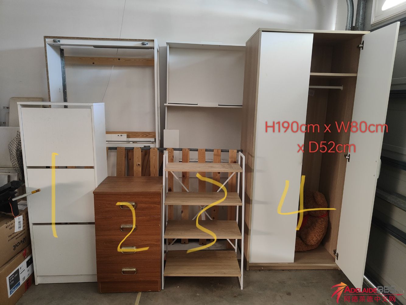各种闲置家具大甩卖1.30号开始可以取,自取地址在东北区Gilles Plains. 1.半拉开鞋柜30.(已出售) 2.实木床头柜10. (已出售) 3.储物架/鞋柜20. (已出售) 4.衣柜60. 5.9成新冰箱冷藏冷冻功能正常20年购入,仅用于疫情 ...