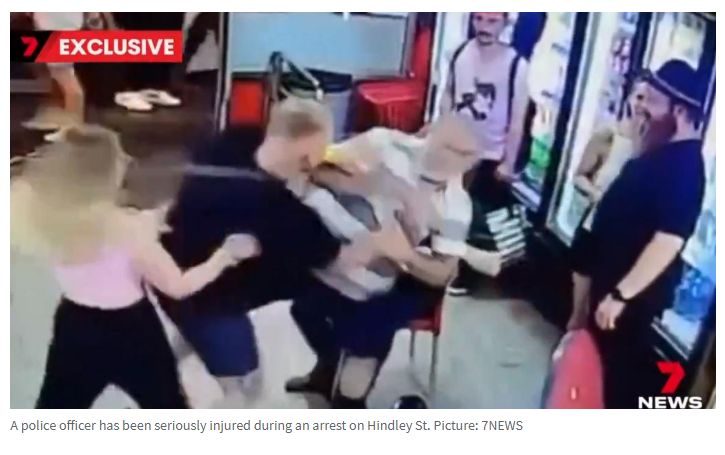 周日凌晨,阿德Hindley St一家广受欢迎的快餐店发生了暴力事件,店主表示,在发生打斗时,他试图保护顾客。 事件发生后,有两人被捕,一名女警官在试图制止斗殴时不慎摔倒,手臂骨折住院。 监控显示 ...