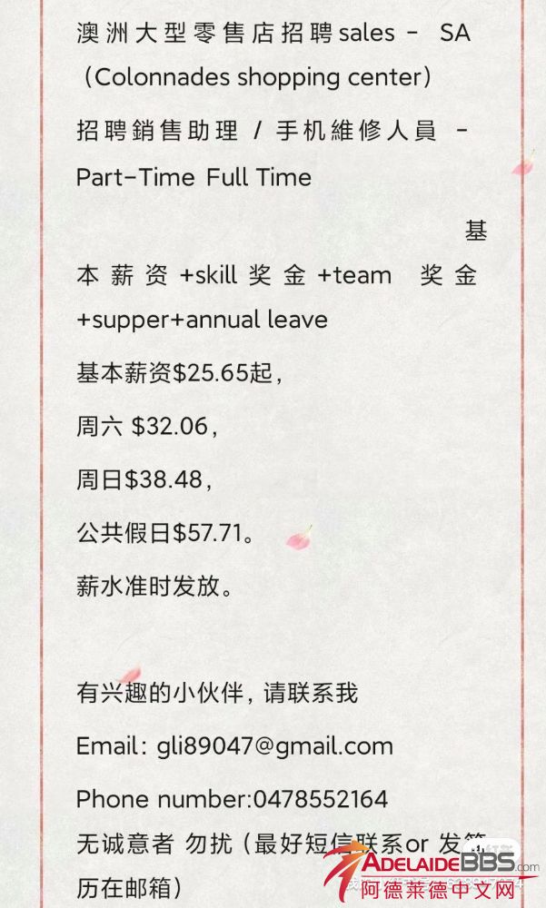 澳洲大型零售店招聘sales–SA (Colonnades shopping center) 招聘銷售助理 /手机維修人員– Part-TimeFull Time &n ...