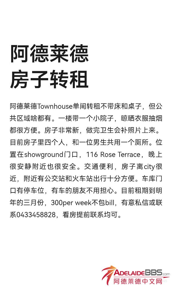 Showground门口单间转租 阿德莱德Townhouse单间转租,一楼带小院子,位置靠近Showground,交通便利,离市中心近,有公交站和火车站。都是直达city和阿大附近的。附近超市加油站药店都有,生活便利。目前租期到明年 ...