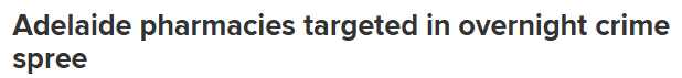 据《9 News》报道,阿德南郊多家药店成为连环犯罪目标,两名窃贼在连续抢劫两处商铺并造成重大损失后逃逸。该团伙在Brighton和Darlington的两次凌晨作案中窃取了止咳糖浆及阿片类药物。 首起案件发生于Brighton,据 ...
