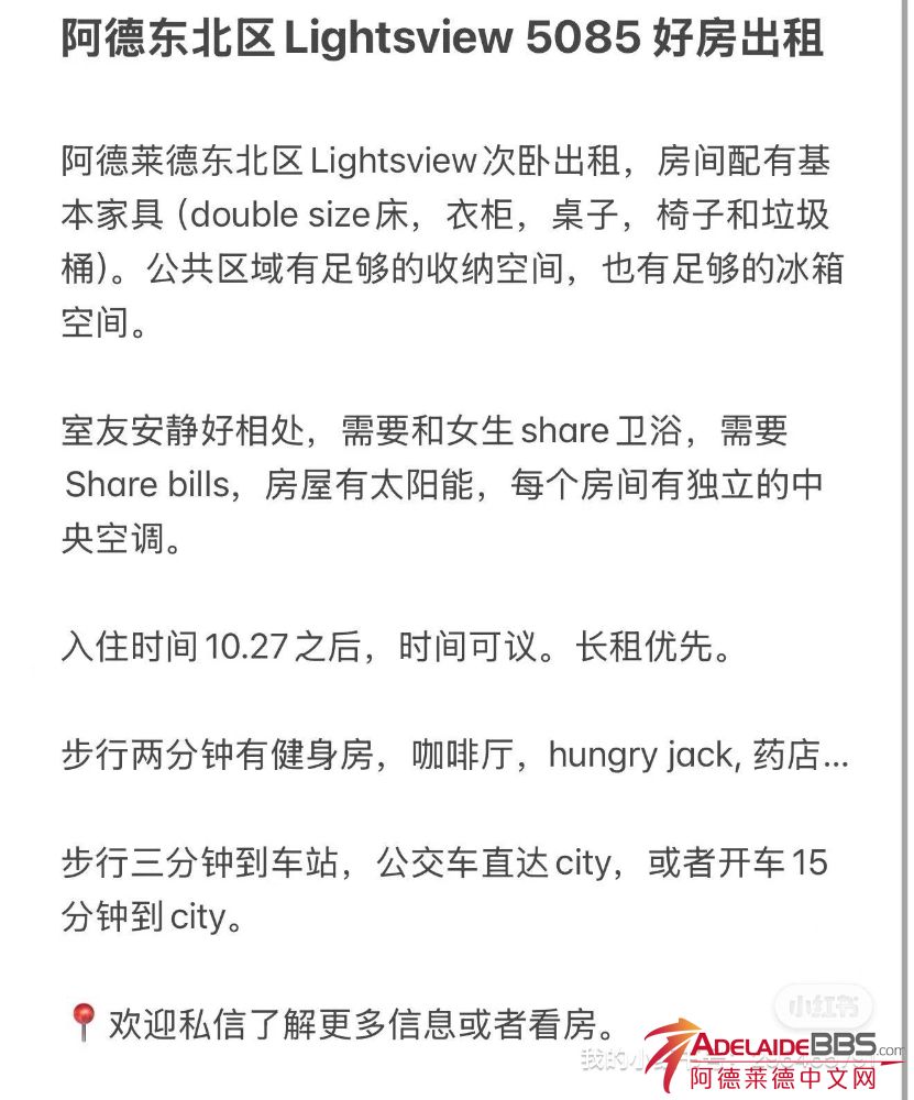 阿德东北区Lightsview好房出租 阿德东北区Lightsview好房出租 阿德莱德东北区Lightsview次卧出租,房间配有基本家具(double size床,衣柜,桌子,椅子和垃圾桶)。公共区域有足够的收纳空间,也有足够的冰箱空间。 ...