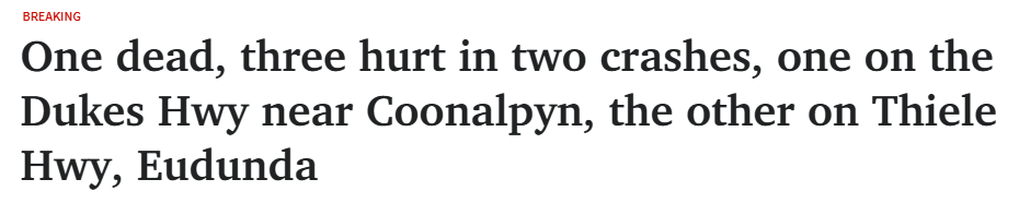 据报道,周日下午,南澳一条主要公路上发生单车侧翻事故,一名33岁男子死亡。 周日下午5点46分,当局接到报警,称Mid North地区Eudunda西南4公里处的Thiele Highway发生一起单车侧翻事故。事故车辆为一辆Holden牌Ut ...