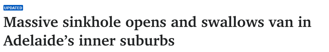 据1月12日报道,周日,一对来自达尔文的夫妇在驱车前往阿德莱德机场的途中,不幸陷入天坑。 这位要求匿名的女士表示,周日清晨,当他们从Hyde Park的Airbnb住处出来,准备开车送丈夫去机场时,发现车道上满是积水。 ...