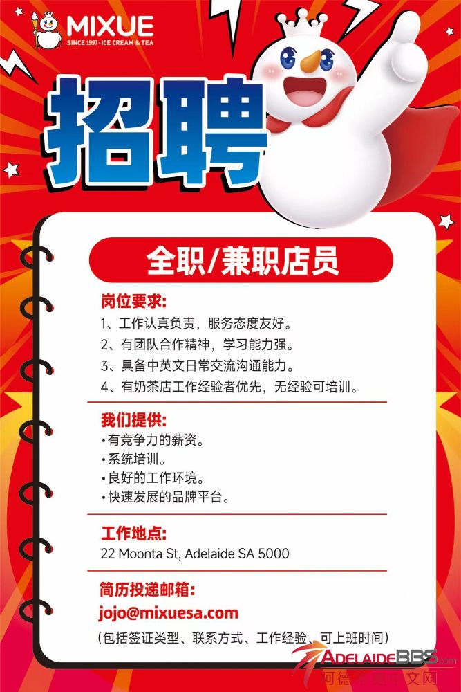 蜜雪冰城-阿德莱德 | 正在招人啦! 想找一份稳定+有成长空间的工作吗? 想在超人气奶茶品牌里一起搞事业吗? 那你一定要这里! 招聘岗位 全职/兼职店员(长期) 我们希望你是: 工作认真负责,服务意识强,待 ...