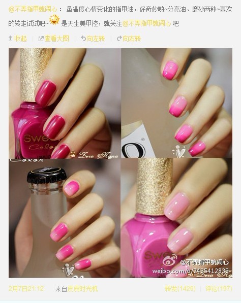 本帖最后由 Princěss. 于 2012-5-2 16:59 编辑 爱美的女孩子一定不要错过哦! 新上市的随温度变色的指甲油,现在可以为你代购咯! 不少女孩子都关注过这条微博,随着温度,随着心情变色的指甲油! 12.蓝莓 ...
