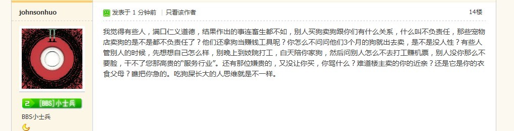 本帖最后由 赫舍里小皮 于 2012-8-26 23:11 编辑 RT,作为宠物版区版主我一直觉得我们宠物版区最和谐了,可是昨天凭空出现一个卖狗的,宠物版区就打乱了的感觉。。。一个卖狗的(其实我想喷他,但是介于他是我妹 ...