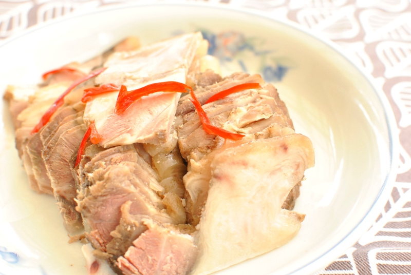 后腿小圆蹄一个,用盐和花椒粉腌制,一天以上。将腌好的小圆蹄放入锅中清水没之,大火待水滚改小火45分钟关火,取出放入容器固定,放入冰箱冷藏室,吃时切片装盘。 小凉菜,请各位笑纳!