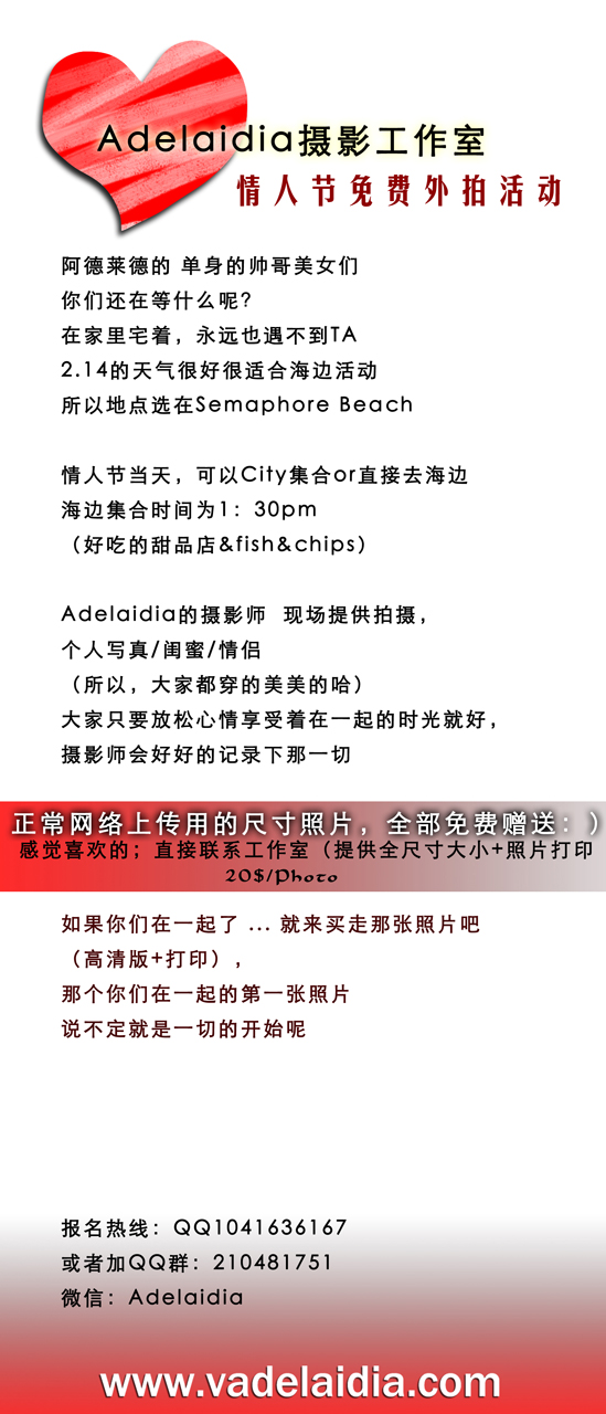 Adelaidia摄影工作室:情人免费外拍活动 阿德莱德的 单身的帅哥美女们 你们还在等什么呢?在家里宅着,永远也遇不到TA2.14的天气很好很适合海边活动所以地点选在Semaphore Beach情人节当 ...