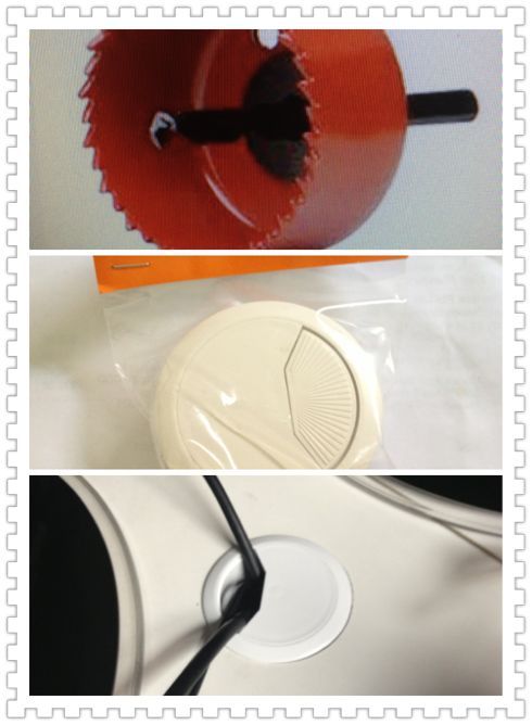 1.BUNNINGS买一个hole saw(60mm-63mm) 2.BUNNINGS买塑料配件。(直径60mm,哪个走线口大买哪个。) 3.成品 电钻打眼,注意哈,要戴眼镜,我的桌子正面没打透,我又躺地上从下面补了两钻,所以一定要戴护目 ...