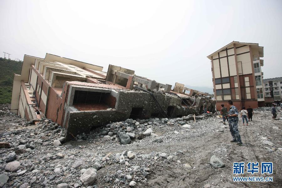 7月15日拍摄的四川省彭州市龙门山镇一被水冲倒的小区楼房。