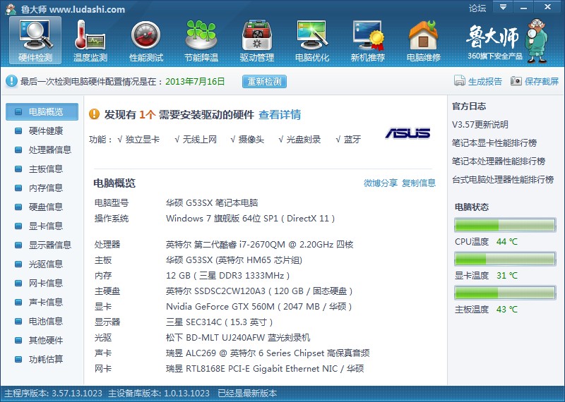 本帖最后由 Anaesthesia 于 2013-7-29 11:43 编辑 12G的内存 http://www.asus.com/Notebooks_Ultrabooks/G53SX/ 这个是官网介绍 我是最高配的 买这个电脑还送windows 8的光盘一张 开机不到20秒 详细信息可 ...
