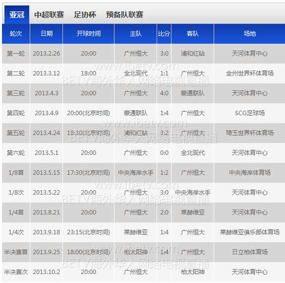 激动人心的亚冠半决赛将于北京时间10月2号20:00在广州天河体育中心举行,广州恒大VS柏太阳神,cctv5貌似有直播 找到一张亚冠自开赛以来到目前为止,恒大的成绩单 总共比赛11场,恒大胜利8场,平2场,负1场 ...