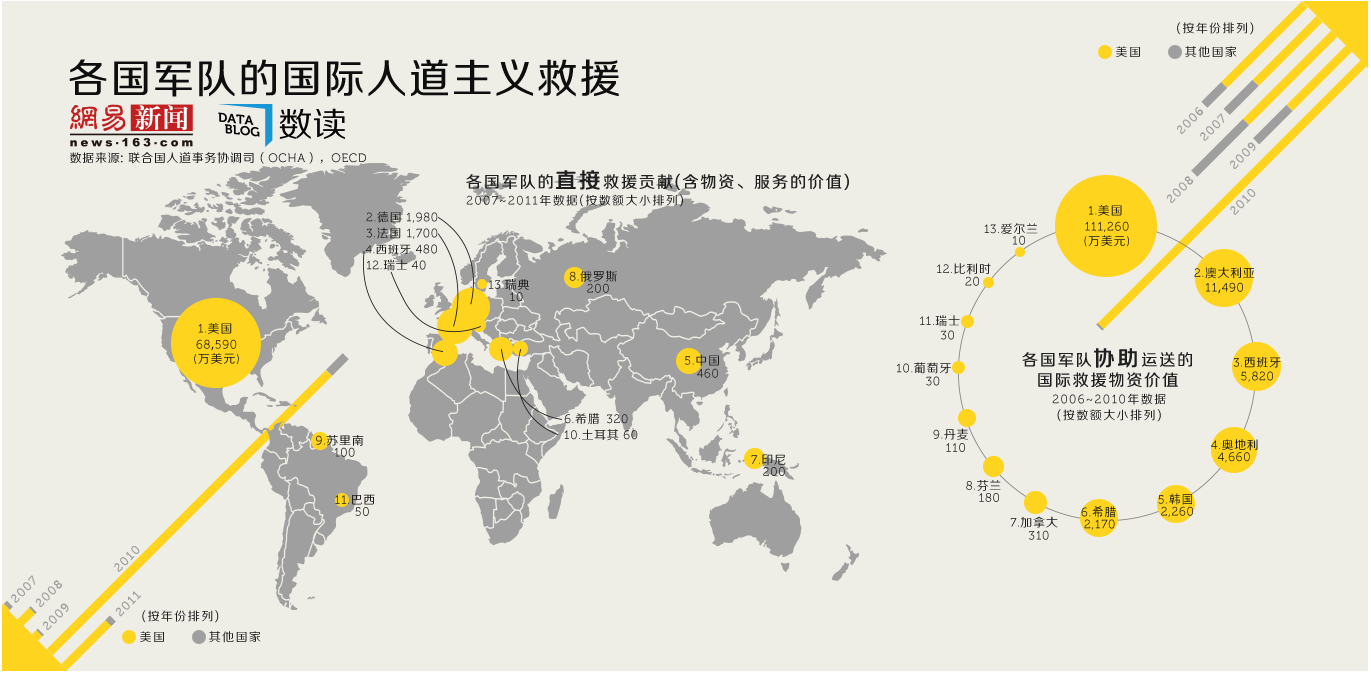 以上提到的军队运输的救援物资实际上来自各方的捐赠,而军队不仅自身会贡献部分物资,还能提供各种应急服务,如搜救、医疗、通讯联络等。这些军队贡献的物资与服务合并折算成金钱也是一笔可观的数目。联合国人道事务协调司的数据显示,2007-2011年各国军队的直接救援贡献(含物资与服务)价值7.4亿美元,而美军又扮演了最关键的角色——其中6.9亿美元是来自美军。