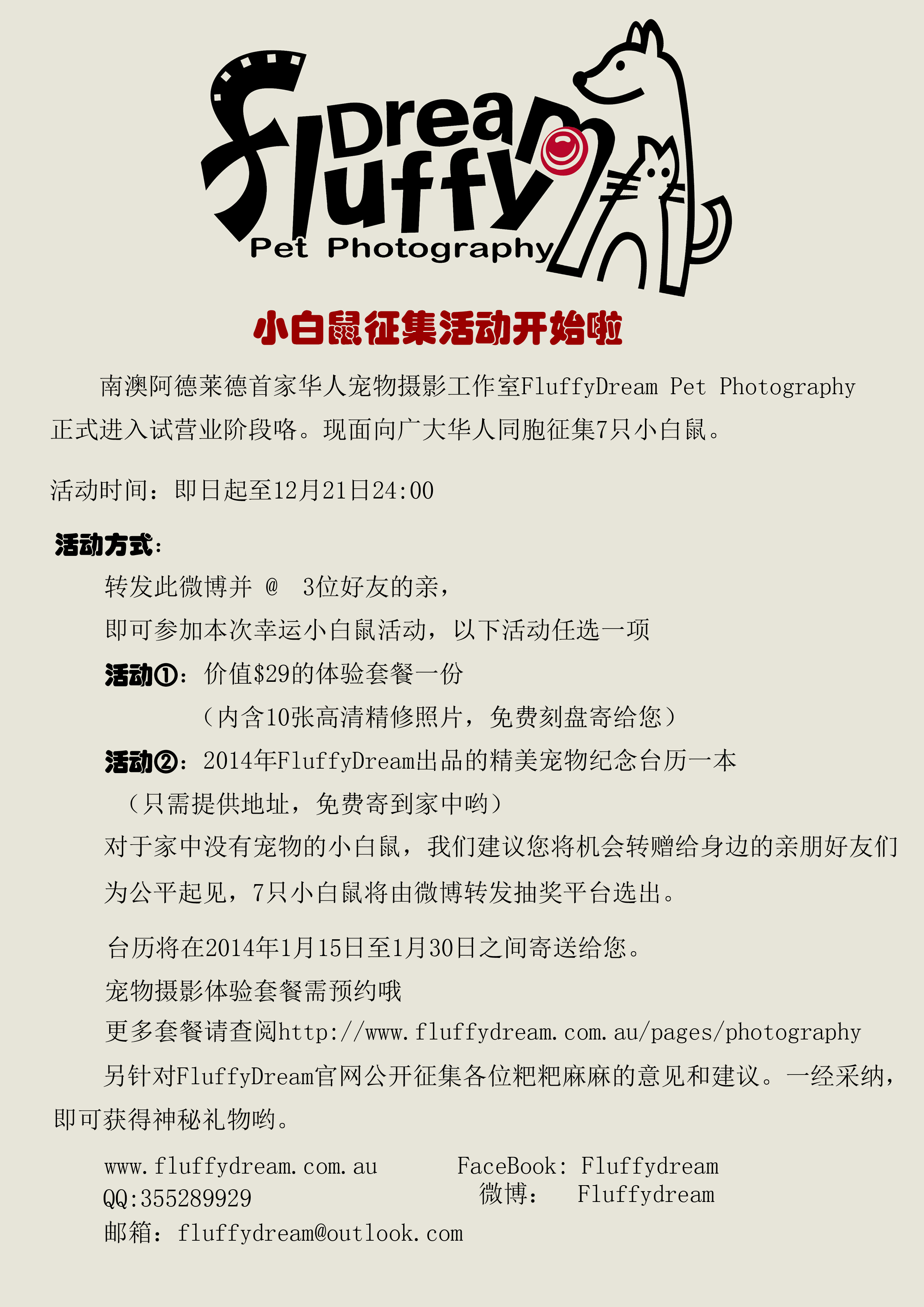 本帖最后由 No.77 于 2013-12-7 19:24 编辑 南澳阿德莱德首家华人宠物摄影工作室正式进入试营业阶段,现针对微博客户群体展开小白鼠征集活动。活动时间:即日起至12月21日24:00 活动方式:转发FluffyDream微博首 ...