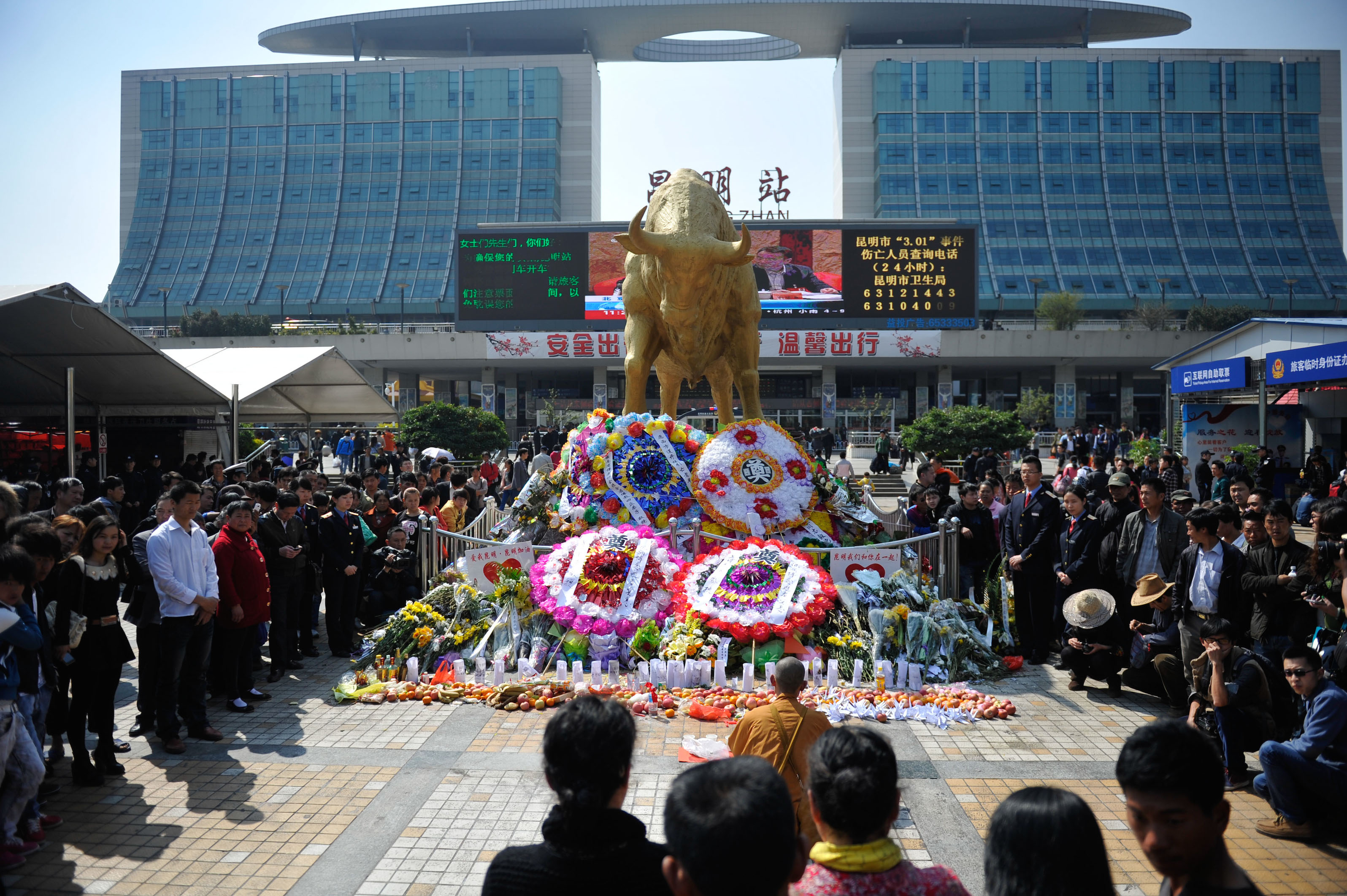 照片版权归XXXX社所有 3月7日,昆明火车站铜牛像下摆满花圈。当日,是昆明“3·01”暴恐案“头七”之日,众多民众来到昆明火车站,深切哀悼遇难者。