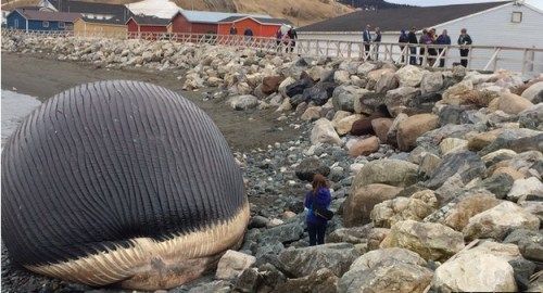 形如气球的蓝鲸头部 据英国广播公司BBC报道,近日,一条蓝鲸的尸体被海水冲上了加拿大纽芬兰岛上一处沿海小镇的石滩上。镇长表示,这条长约25米的蓝鲸尸体由于体内充满了甲烷,其头部膨胀成了一个大气 ...