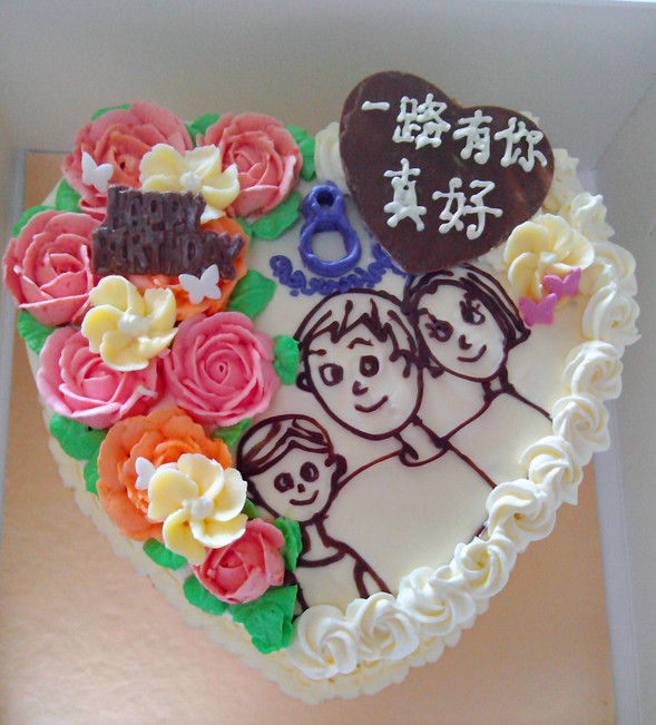为结婚纪念日和太太生日特别定做的蛋糕。接到要求,第一反应:心形蛋糕体和奶油花是必备的元素!画了个草图给客户,经过沟通后确定蛋糕的装饰图案-玫瑰花,简笔画之一家三口,巧克力牌。 近期 ...