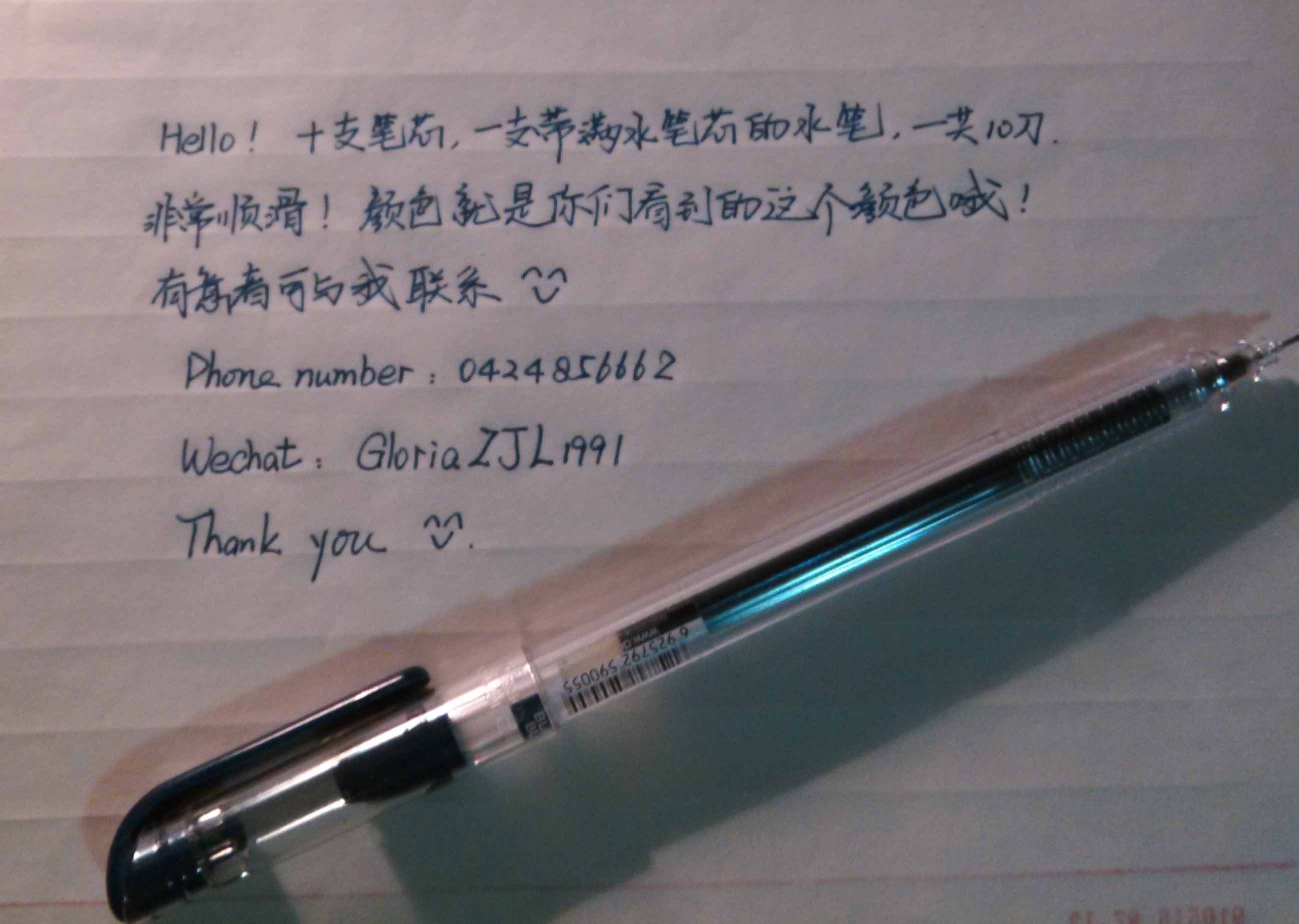 现有十支笔芯以及一只水笔出售,颜色如图所示(请原谅幽暗滴灯光~),写字很顺滑流畅,一共10刀。 有意者请与我联系,电话是0424856662, 微信:GloriaZJL1991 thank you!!