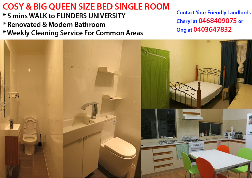 房间出租: 步行5分钟到Flinders大学.单间价格$160每周. 水,电,网络全包, 每周清洁包括. 房间有配套齐全的女王大床,衣柜和学习桌.即时入住。绝佳地段,近公交车站,marion 购物中心, Flinders 大学, Flinders医疗 ...