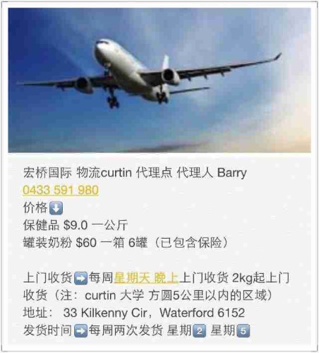保养品:$9 一公斤 奶粉: $60 一箱 需上传身份证 走海关 内含保险 两周到货 运输渠道:顺丰 EMS 联系人:nora 0451868648。barry 0433591980