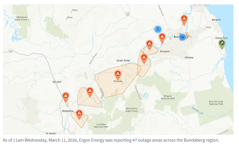 截至周三上午11点,Ergon Energy报告Bundaberg地区有47处停电区域。这些区域包括从Wallaville到海岸的Burnett River沿岸大片地区,以及河以南市中心内的多个较小停电区域。当局需要等待洪水大幅退去后才能恢复这些地区的供电。