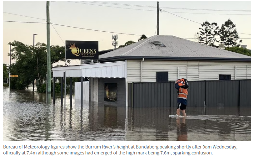 气象局的数据显示,Burnett River在Bundaberg河段的水位于周三上午9点后不久达到峰值,官方记录为7.4米。河流上游的洪水水位均稳定或下降,且预报无进一步降雨,预计最严重的洪水已经过去。