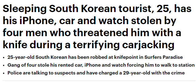 停车后一定要锁车!锁车!锁车! 要不然可能会有被打劫的风险! 本周二凌晨(9月18日)3点左右,一名韩国游客在昆州冲浪者天堂被一伙人持刀抢劫。 高级警官Dane Sheraton表示,他们已经抓获了一名Southport ...