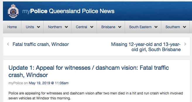 星期六晚上,布里斯班Windsor发生一起7车相撞的严重事故, 之后,该车辆上的两人步行逃离现场。 驾驶摩托车的男子和斯巴鲁车司机当场死亡。 留在宝马车上的第三人,一名24岁的女子受伤被送往医院, ...