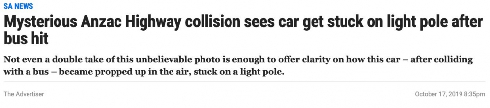 阿德莱德发生了一场离奇的车祸! 一辆小车与公交车相撞后,一头冲上了路边的路灯杆,几乎垂直架在了空中! 没有人严重受伤,但是向南行驶的车辆在车祸地点周围缓慢地前进。 到晚上7点,现场已经清理干净。 ...