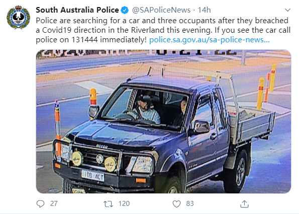 南澳警方正在搜寻一辆维州车牌的汽车和三名乘客,他们7月18日晚上违反了Covid19的规定。