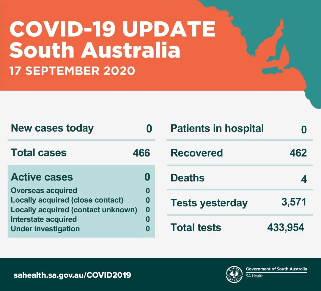 在过去的24小时内,南澳零新增。 目前南澳无活跃病例,已进行了433954次病毒检测。