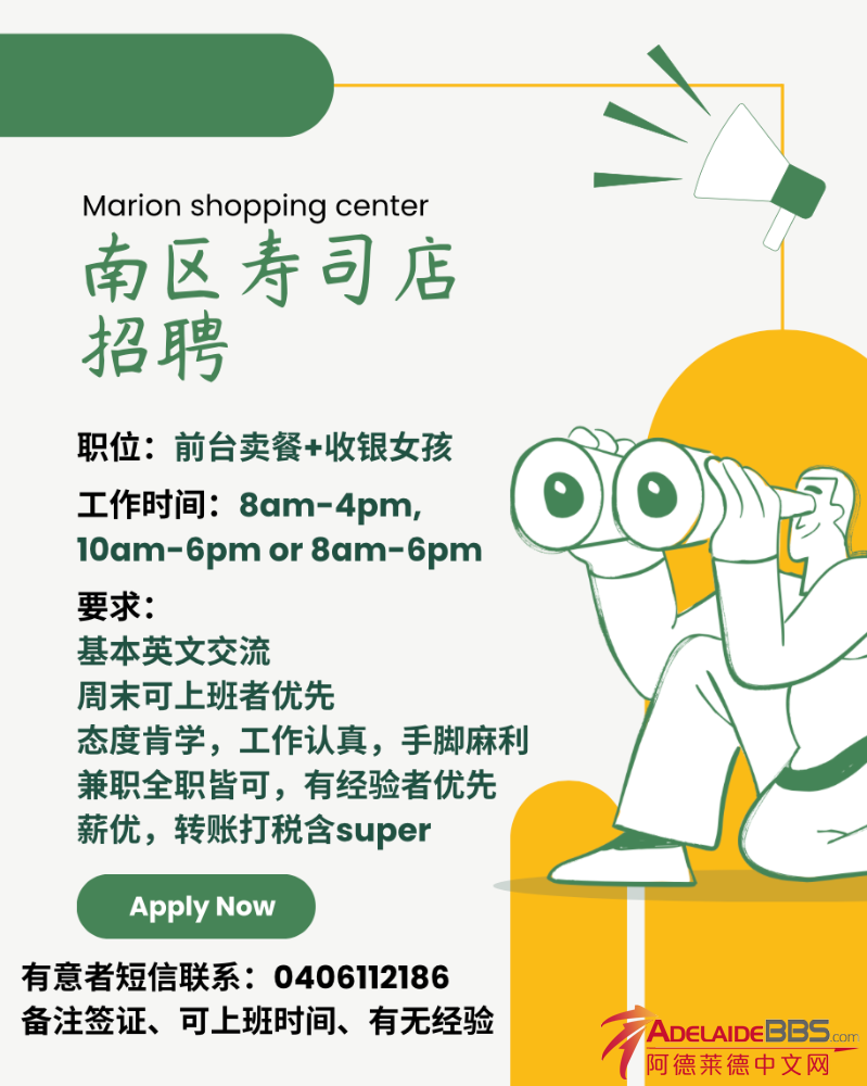 地点:南区Marion shopping center 职位:寿司店 前台女孩卖餐+收银 工作时间:8am~4pm、10~6或者8~6 要求:可以基本英文交流,态度肯学,工作认真,手脚麻利,兼职全职皆可,有经验者优先,薪优,转账打税含super ...