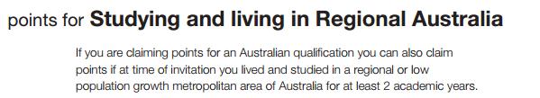 两年学时:只要能够满足移民分数即可毕业后免工作经验直接申请绿卡,但是新政策下对两年学时的界定将更加严格。最大的变化莫过于取消了所谓“相关性”概念,提名职业必须与两年学时的所学专业紧密相关(closely related)。目前看来,要满足两年学时必须同时满足下列条件: 1. 所学课程是CRICOS登记的课程(至少是注册为92周的课程) 2. 完成了至少2个学术年的学习 3. 完成了至少16个自然月的学习 4. 在澳洲境内完成的学习,同时所持有的澳洲签证不禁止学习 5. 该学习必须用英语授课 http://www.immi.gov.au/skilled/g ... ional-growth.htm#wa 偏远地区5分学历加分,你的澳洲2年学历,学校的邮编在这些区域,才能获得澳洲2年偏远地区的5分加分。 |