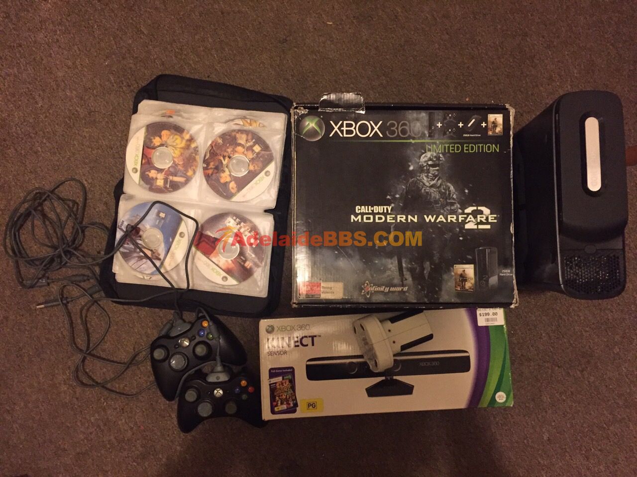 XBOX是250G破解版的使命召唤现代战争2限量版,两个手柄,四块电池,还有个座充,一个Kinect摄像头,盒子还在,游戏一共有200多张,正版盗版全有,机器一切正常,游戏估计都够玩到毕业了 PS3只有机器和一个手柄, ...
