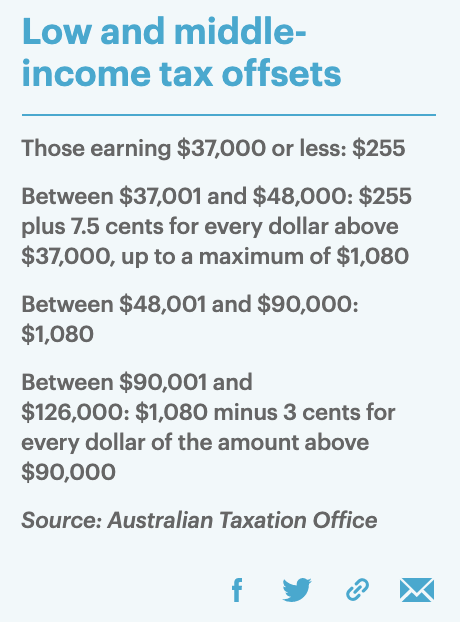 年收入低于3.7万澳元的澳大利亚人在财政年结束时能获得255澳元的减税;大约340万年收入在4.8万到9万澳元的人,可减税1080澳元;年收入高达12.6万澳元的人,税收减免将逐步取消。
