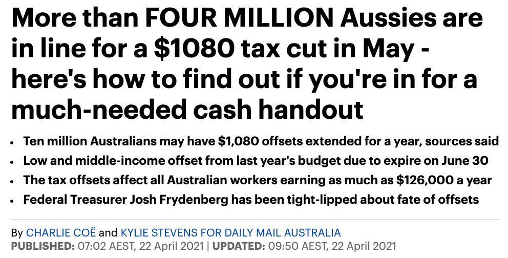 标题: 【生活】联邦政府考虑将个税减免政策再延一年!上千万澳人可减税高达$1080!