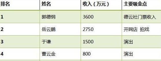 娱乐圈赚钱容易众所周知,一线明星拍一部戏数千万,还能大量用替身。至少在中国是赚钱最轻松的职业了。奥!对某些人来说不是职业,是行业。相对来说,相声圈的收入比演艺圈低多了。先看一份相声演员收入排行榜。 ...