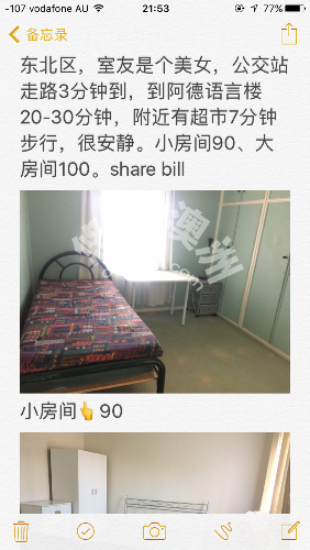 东北区好房子,距离bus站3分钟,附近有绿源超市、coles.距离阿德语言楼20-30分钟。社区很安静,目前室友是阿德在读学生女生。仅招女生。大房间100、小房间90。share bill。可微信songsong012,0420955317