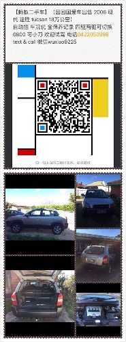 朋友要回国,打算把爱车卖掉。此贴帮朋友发的。因回国爱车出售 2006 现代 途胜 tucson 18万公里 自动挡 车况优 全保养记录 四驱两驱可切换 6800 可小刀 欢迎试驾 电话0422050998 text & call 微信wuxiao9225