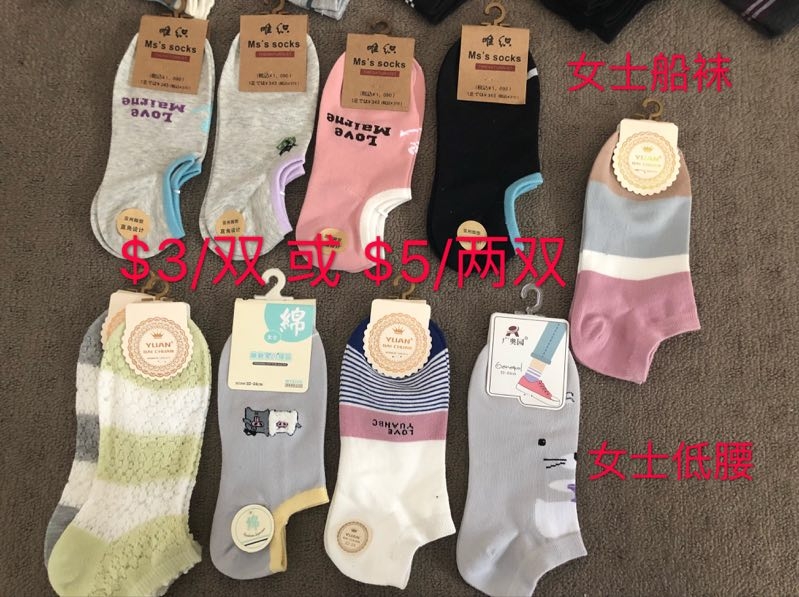 男女纯棉袜子出售: 男/船袜和低腰:3刀/每双 5刀/两双 女/船袜和低腰:3刀/每双 5刀/两双 量大有优惠,30刀起可以送货15KM以内。 如果想要高腰也可以联系,谢 ...