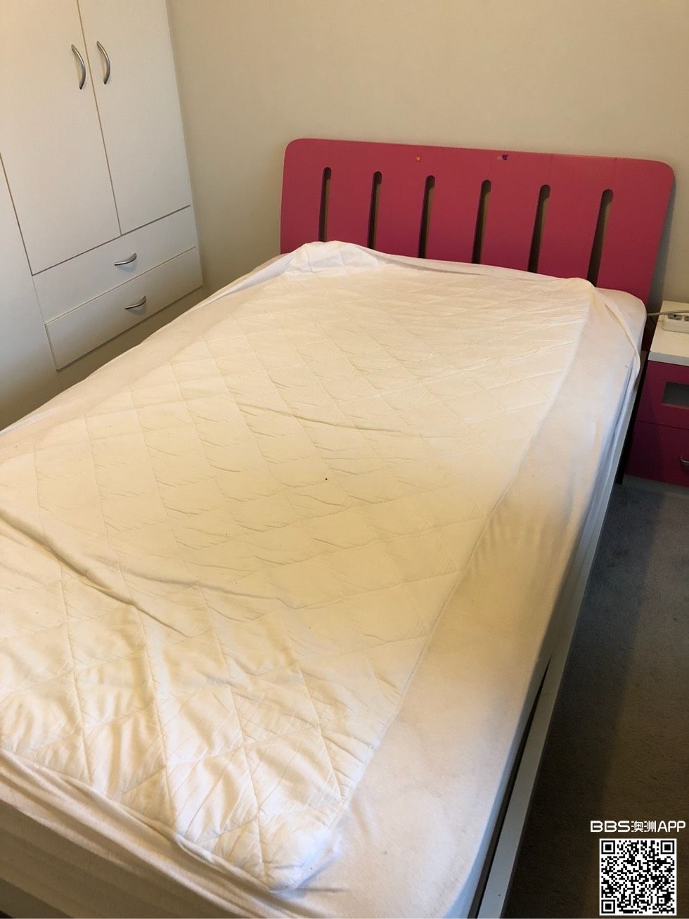 床是king single ,下面是像国内床那种2块大的木板,不是像澳洲有的床一样是木条,床垫很新。床加床垫加床头柜总共一起$180刀。已经降价,这个set不刀,不能分开卖 座位$30(已卖), 台灯*2 各$10, 桌子$30(已卖). ...