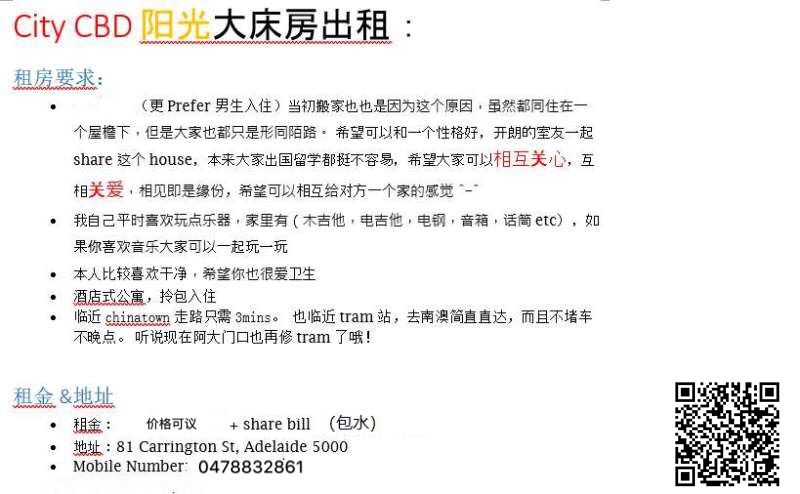 三分钟走路可到Chinatown,有免费Tram去Rundel mall,走路去学校也相当的近~公交费都省了 偏向男生入住. 快来预约看房吧~