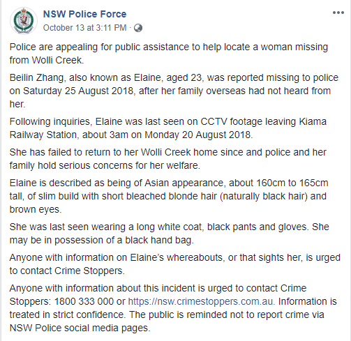 又一个华人在澳失踪!新州警方发文寻人! 由于失踪时间过长,现在警方十分担心该女子的境况! 警方呼吁,任何知情人士请立即拨打灭罪热线:1800 333 000,帮助警方破案。 希望这 ...