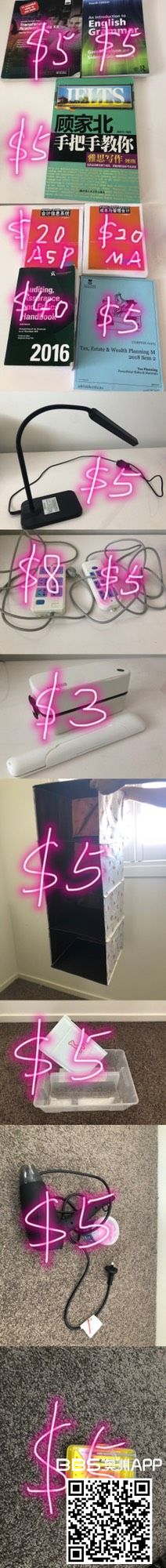 语言班语法书,顾家北写作—5刀 会计ASP,MA—20刀 会计auditing考试可带—40刀 通用开卷选修课用书,躺着都能过—5刀 全新餐具—3刀 公牛插线板—大8小5 收纳盒镜子—五刀 台灯—5刀 吹风机—5刀 螺丝刀合集—5刀 ...