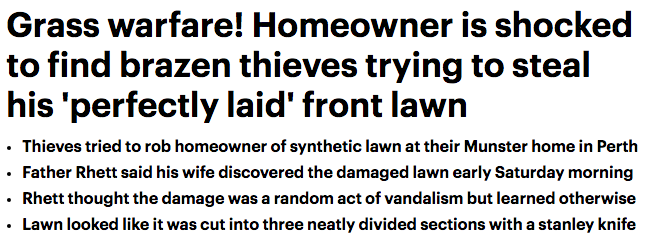 这年头小偷不仅很猖狂,而且真的是不论什么都偷啊! 这不,家住珀斯Munster的房主Rhett就惊讶的发现自家门前的人工草坪就被偷了! 起初Rhett还以为这是谁的恶作剧之类的把戏,后来经过仔细的检查发现草坪 ...