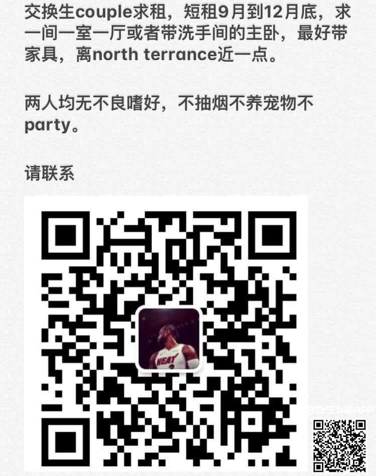 春季交换生Couple 求租 , 短租9月到12月底,求 一室一厅 或者带洗手间的主卧。 最好带家具 离 North Terrance 近一些 两人均无不良嗜好,不抽烟, 不养宠物 不 Party 请联系 微信 jane19901130 ; l ...
