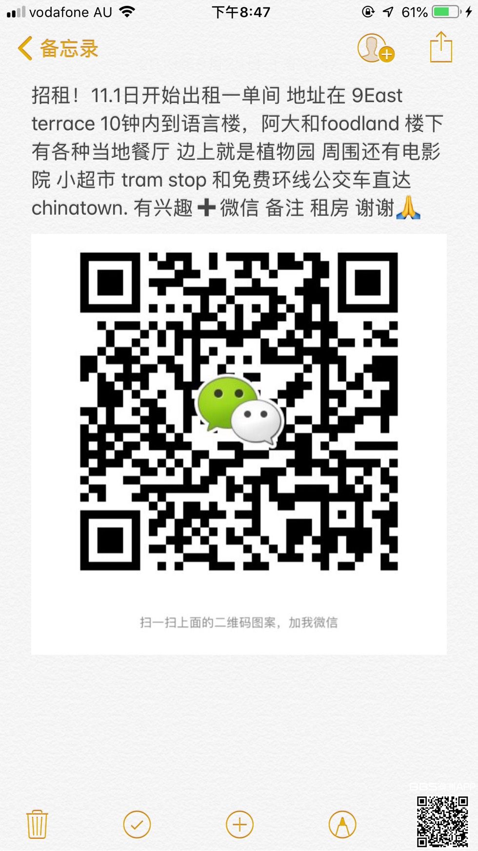 招租!11.1日开始出租一单间 带独立阳台常棒的!地址在 9East terrace 10钟内到语言楼,阿大和foodland 楼下有各种当地餐厅 边上就是植物园 周围还有电影院 小超市 tram stop 和免费环线公交车直达cpphinatown. 有兴 ...